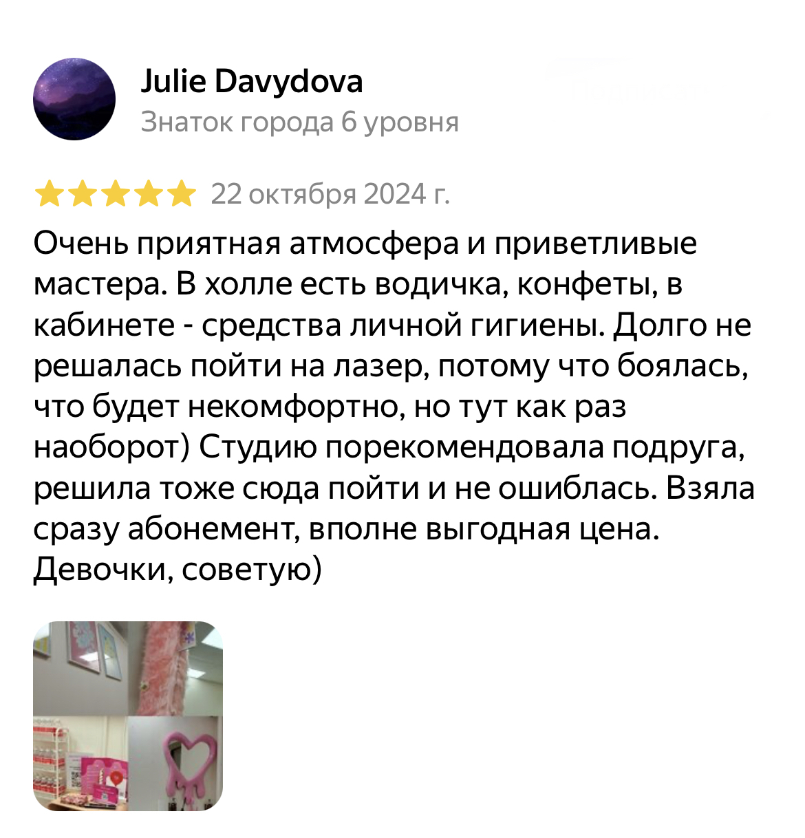 Мы не «просто делаем эпиляцию» — мы ведём вас к гладкой коже: подбираем параметры лазера и график процедур под вашу кожу и зону, чтобы результат был заметным и стабильным.